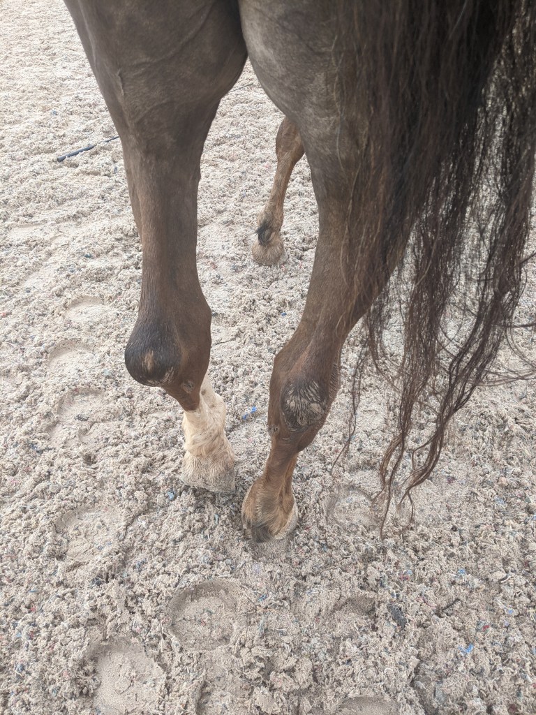 Leaving us with a slight problem. The hock is still reasonably massive. It has gone down and it is more localised to the hock but definitely still has fluid in there.